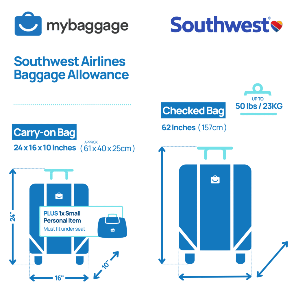 The maximum size for carry on luggage on Southwest Airlines is 24 x 16 x 10 inches (61 x 41 x 25 cm), including handles and wheels. Bags larger than this must be checked. Southwest is strict about these limits, so always measure your bag before traveling to avoid problems at the gate.