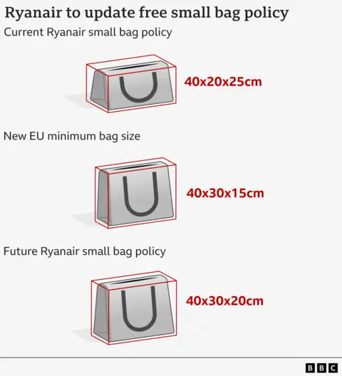 | Ryanair | 55x40x20 cm, 8 kg (priority only) | 40x20x25 cm | 1 bag, same size, 10 kg |